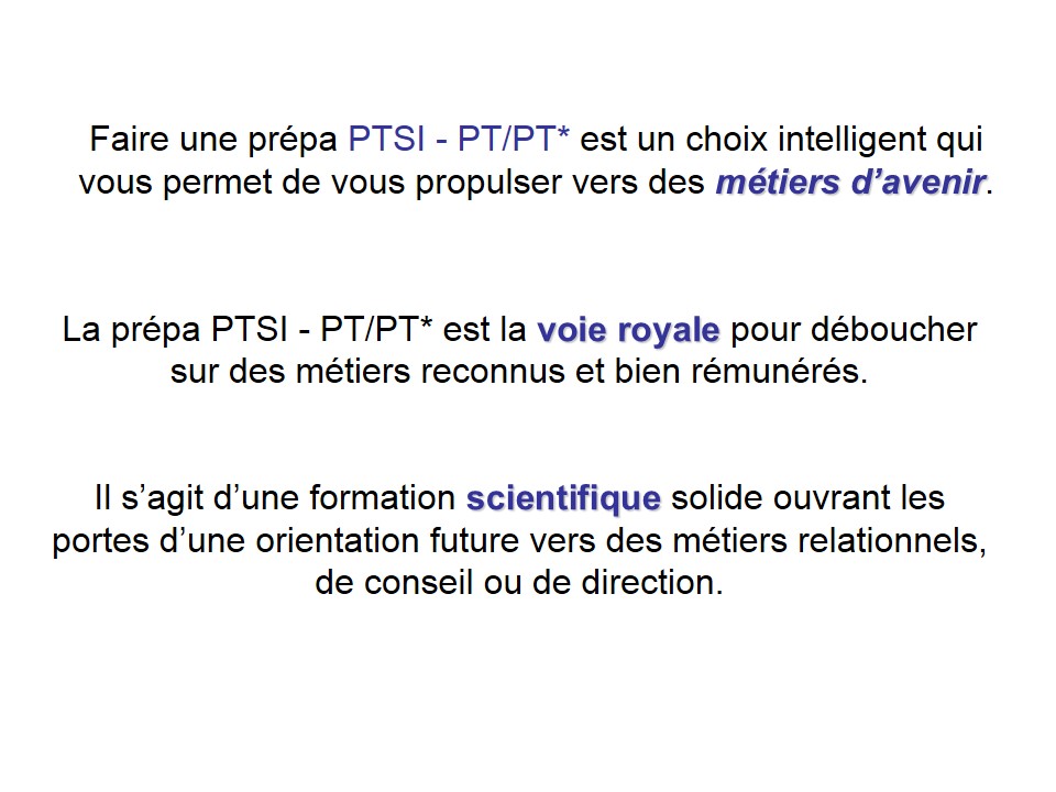 •  La prépa PTSI - PT/PT* est la voie royale pour déboucher sur des métiers reconnus et bien rémunérés.