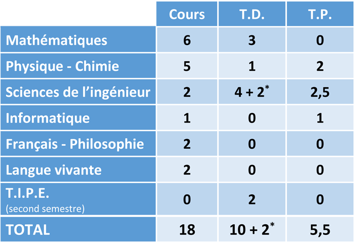 * Pour les étudiants n'ayant pas suivi a spécialité SI en teminale, des heures de soutien sont prévues.