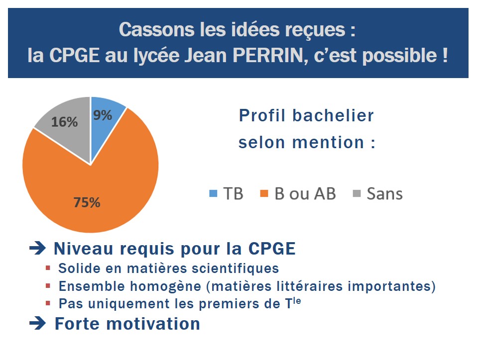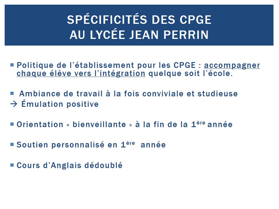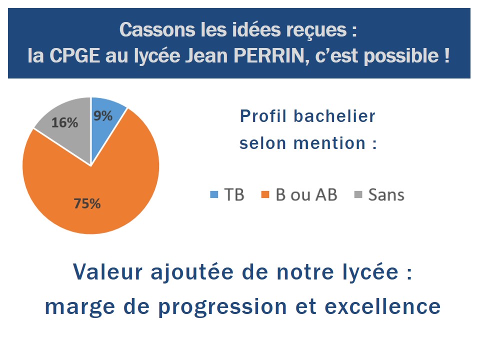 Grâce aux deux sections parallèles de PT* et PT, chaque étudiant peut trouver un rythme qui lui est adapté et ainsi accéder à l’école d’ingénieur correspondant le mieux à son profil. Au final, sur 3 ans, 100% des étudiants de PT-PT* du lycée Jean PERRIN intègrent une Grande Ecole.
